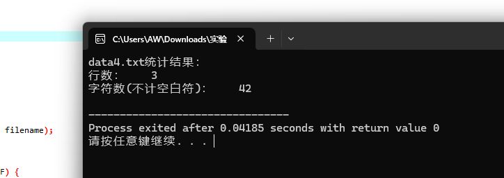 #include <stdio.h> #include <ctype.h> int main() { FILE *file; char filename[] = "data4.txt"; int line_count = 0; int char_count = 0; int ch; int in_line = 0; file = fopen(filename, "r"); if (file == NULL) { printf("无法打开文件 %s\n", filename); return 1; } while ((ch = fgetc(file)) != EOF) { if (ch == '\n') { line_count++; in_line = 0; } else if (!isspace(ch)) { char_count++; in_line = 1; } } if (in_line) { line_count++; } fclose(file); printf("%s统计结果:\n", filename); printf("行数: %d\n", line_count); printf("字符数(不计空白符): %d\n", char_count); return 0; }