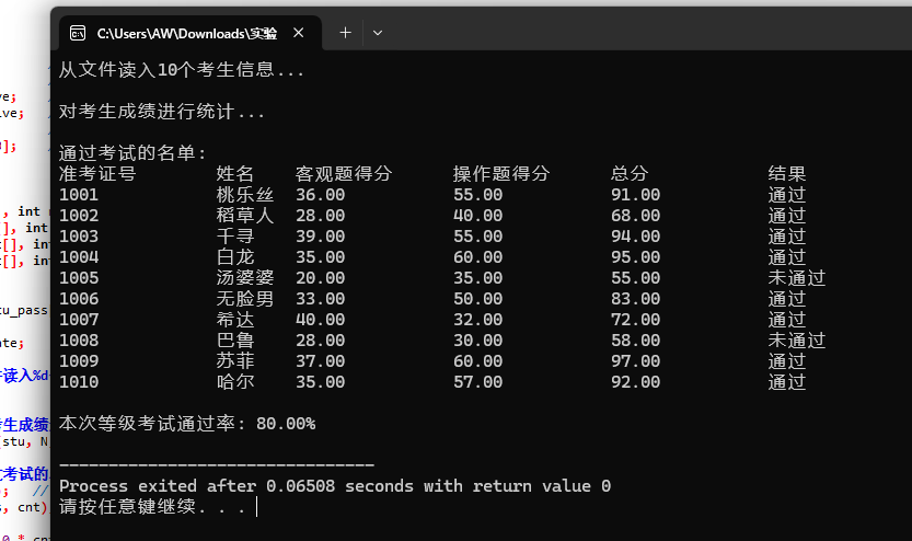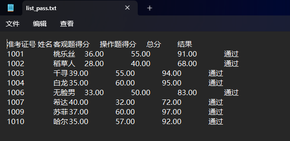 #include <stdio.h> #include <string.h> #define N 10 typedef struct { long id; // 准考证号 char name[20]; // 姓名 float objective; // 客观题得分 float subjective; // 操作题得分 float sum; // 总分 char result[10]; // 考试结果 } STU; // 函数声明 void read(STU st[], int n); void write(STU st[], int n); void output(STU st[], int n); int process(STU st[], int n, STU st_pass[]); int main() { STU stu[N], stu_pass[N]; int cnt; double pass_rate; printf("从文件读入%d个考生信息...\n", N); read(stu, N); printf("\n对考生成绩进行统计...\n"); cnt = process(stu, N, stu_pass); printf("\n通过考试的名单:\n"); output(stu, N); // 输出所有考生完整信息到屏幕 write(stu_pass, cnt); // 输出考试通过的考生信息到文件 pass_rate = 1.0 * cnt / N; printf("\n本次等级考试通过率: %.2f%%\n", pass_rate*100); return 0; } // 把所有考生完整信息输出到屏幕上 void output(STU st[], int n) { int i; printf("准考证号\t姓名\t客观题得分\t操作题得分\t总分\t\t结果\n"); for (i = 0; i < n; i++) printf("%ld\t\t%s\t%.2f\t\t%.2f\t\t%.2f\t\t%s\n", st[i].id, st[i].name, st[i].objective, st[i].subjective, st[i].sum, st[i].result); } // 从文本文件examinee.txt读入考生信息 void read(STU st[], int n) { int i; FILE *fin; fin = fopen("examinee.txt", "r"); if (!fin) { printf("fail to open file\n"); return; } for (i = 0; i < n; i++) { fscanf(fin, "%ld %s %f %f", &st[i].id, st[i].name, &st[i].objective, &st[i].subjective); } fclose(fin); } // 把通过考试的考生完整信息写入文件list_pass.txt void write(STU s[], int n) { FILE *fout; int i; fout = fopen("list_pass.txt", "w"); if (!fout) { printf("fail to create file\n"); return; } fprintf(fout, "准考证号\t姓名\t客观题得分\t操作题得分\t总分\t\t结果\n"); for (i = 0; i < n; i++) { fprintf(fout, "%ld\t\t%s\t%.2f\t\t%.2f\t\t%.2f\t\t%s\n", s[i].id, s[i].name, s[i].objective, s[i].subjective, s[i].sum, s[i].result); } fclose(fout); } // 对考生信息进行处理 int process(STU st[], int n, STU st_pass[]) { int i, pass_cnt = 0; for (i = 0; i < n; i++) { // 计算总分 st[i].sum = st[i].objective + st[i].subjective; // 判断是否通过 if (st[i].sum >= 60) { strcpy(st[i].result, "通过"); // 将通过的考生信息复制到st_pass数组 st_pass[pass_cnt] = st[i]; pass_cnt++; } else { strcpy(st[i].result, "未通过"); } } return pass_cnt; }