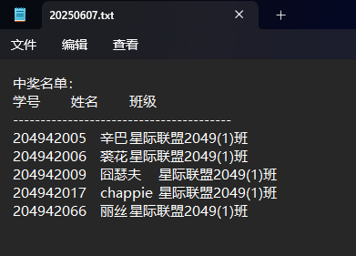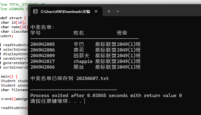 #include <stdio.h> #include <stdlib.h> #include <string.h> #include <time.h> #define TOTAL_STUDENTS 80 #define WINNERS 5 typedef struct { char id[10]; // 学号 char name[20]; // 姓名 char className[30]; // 班级名称 } Student; void readStudents(Student students[], const char* filename); void selectWinners(Student students[], Student winners[], int total, int winnersCount); void displayWinners(Student winners[], int count); void saveWinnersToFile(Student winners[], int count, const char* filename); void generateDateFilename(char* filename); void sortWinnersById(Student winners[], int count); int main() { Student students[TOTAL_STUDENTS]; Student winners[WINNERS]; char filename[100]; srand((unsigned int)time(NULL)); readStudents(students, "list.txt"); selectWinners(students, winners, TOTAL_STUDENTS, WINNERS); sortWinnersById(winners, WINNERS); printf("\n中奖名单:\n"); displayWinners(winners, WINNERS); generateDateFilename(filename); saveWinnersToFile(winners, WINNERS, filename); printf("\n中奖名单已保存到 %s\n", filename); return 0; } void readStudents(Student students[], const char* filename) { FILE* file = fopen(filename, "r"); if (file == NULL) { printf("无法打开文件 %s\n", filename); exit(1); } int i; for (i = 0; i < TOTAL_STUDENTS; i++) { fscanf(file, "%s %s %[^\n]", students[i].id, students[i].name, students[i].className); } fclose(file); } void selectWinners(Student students[], Student winners[], int total, int winnersCount) { int selected[TOTAL_STUDENTS] = {0}; int count = 0; while (count < winnersCount) { int index = rand() % total; if (!selected[index]) { winners[count] = students[index]; selected[index] = 1; count++; } } } void sortWinnersById(Student winners[], int count) { int i,j; for (i = 0; i < count - 1; i++) { for (j = 0; j < count - i - 1; j++) { if (strcmp(winners[j].id, winners[j + 1].id) > 0) { Student temp = winners[j]; winners[j] = winners[j + 1]; winners[j + 1] = temp; } } } } void displayWinners(Student winners[], int count) { printf("学号\t\t姓名\t\t班级\n"); printf("----------------------------------------\n"); int i; for (i = 0; i < count; i++) { printf("%s\t%s\t%s\n", winners[i].id, winners[i].name, winners[i].className); } } void generateDateFilename(char* filename) { time_t now; struct tm* timeinfo; time(&now); timeinfo = localtime(&now); strftime(filename, 20, "%Y%m%d.txt", timeinfo); } void saveWinnersToFile(Student winners[], int count, const char* filename) { FILE* file = fopen(filename, "w"); if (file == NULL) { printf("无法创建文件 %s\n", filename); exit(1); } fprintf(file, "中奖名单:\n"); fprintf(file, "学号\t\t姓名\t\t班级\n"); fprintf(file, "----------------------------------------\n"); int i; for (i = 0; i < count; i++) { fprintf(file, "%s\t%s\t%s\n", winners[i].id, winners[i].name, winners[i].className); } fclose(file); }