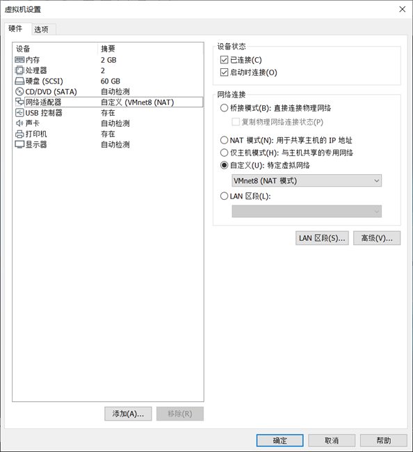 选择自定义模式则在虚拟机系统里面设置好固定的IP地址(这个IP地址就是后面登录服务器用的IP地址)