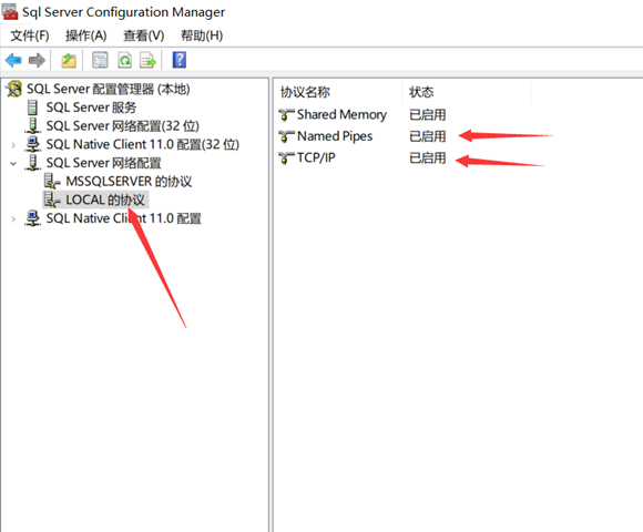 在数据库配置管理器里面选择需要使用的实例服务启用Named pipes和TCP/IP