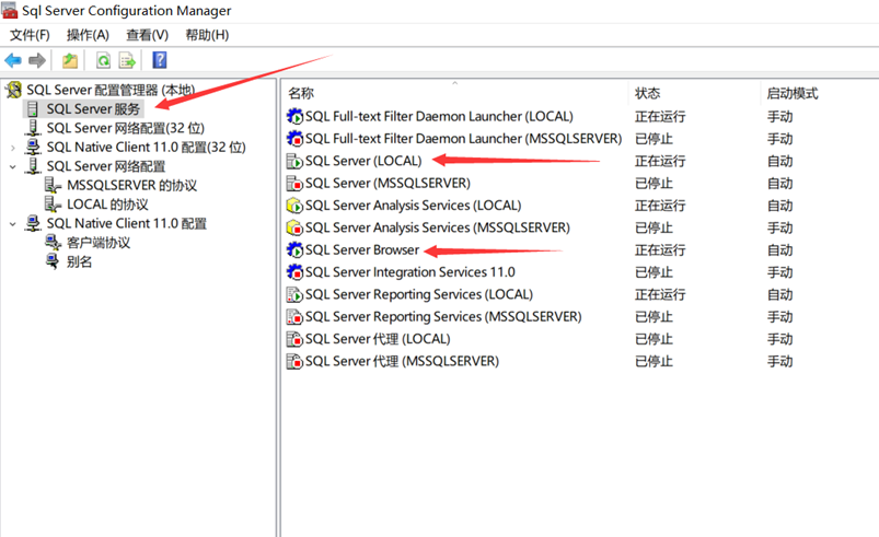 保证实例服务和SQL Server Bowser运行(LOCAL为实例名)