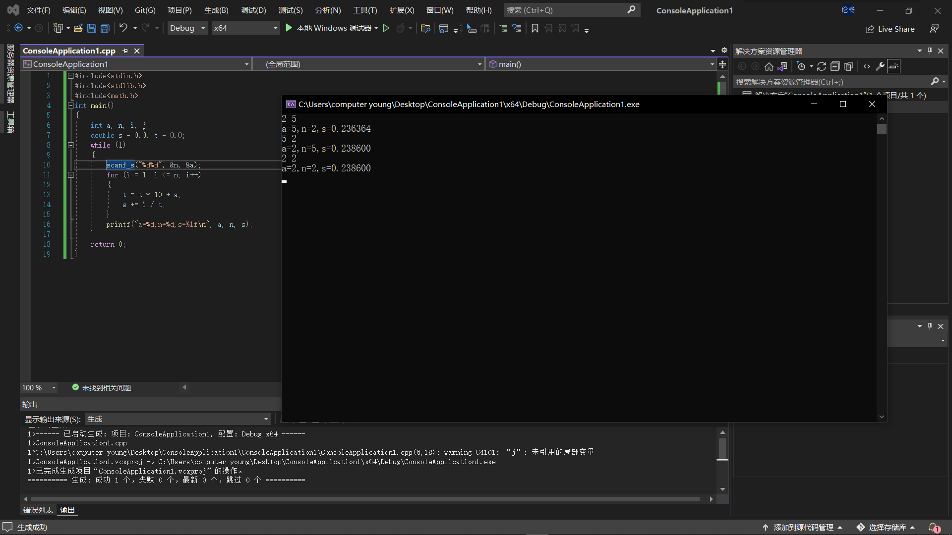 printf("a=%d,n=%d,s=%lf\n",a,n,s);