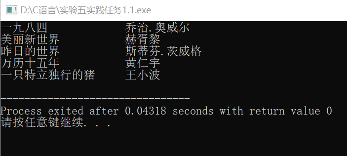 #include <stdio.h> #define N 5 #define M 80 typedef struct { char name[M]; // 书名 char author[M]; // 作者 }Book; int main() { Book x[N] = { {"一九八四", "乔治.奥威尔"}, {"美丽新世界", "赫胥黎"}, {"昨日的世界", "斯蒂芬.茨威格"}, {"万历十五年", "黄仁宇"}, {"一只特立独行的猪", "王小波"} }; int i; FILE *fp; // 以写的方式打开文本文件data1.txt fp = fopen("data1.txt", "w"); // 如果打开文件失败,输出提示信息并返回 if(fp == NULL) { printf("fail to open file\n"); return 1; } // 将结构体数组x中的图书信息写到fp指向的文件data1.txt // 同时也输出到屏幕上 for(i=0; i<N; ++i) { fprintf(fp, "%-20s %-20s\n", x[i].name, x[i].author); printf("%-20s %-20s\n", x[i].name, x[i].author); } fclose(fp); return 0; }