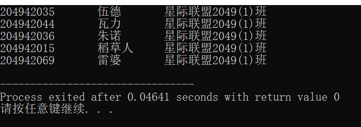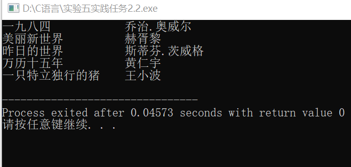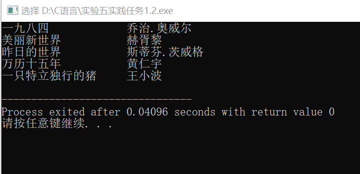 //task 1_2.c// //从文本文件data.1.txt中读取图书信息,并打印输出屏幕 #include<stdio.h> #define N 5 #define M 80 typedef struct { char name[M]; //书名 char author[M];//作者 }Book; int main() { Book x[N]; int i; FILE *fp; //以只读的方式打开文本data.1.txt fp = fopen("data1.txt","r"); //如果打开文件失败,输出提示信息并返回 if(fp==NULL) { printf("fail to open file\n"); return 1; } //从fp 指向的文件data.1.txt中读取信息到结构体数组x //同时,把x的内容输出到屏幕上 for(i=0;i<N;++i) { fscanf(fp,"%s %s\n",x[i].name,x[i].author); printf("%-20s %-20s\n",x[i].name,x[i].author); } fclose(fp); return 0; }