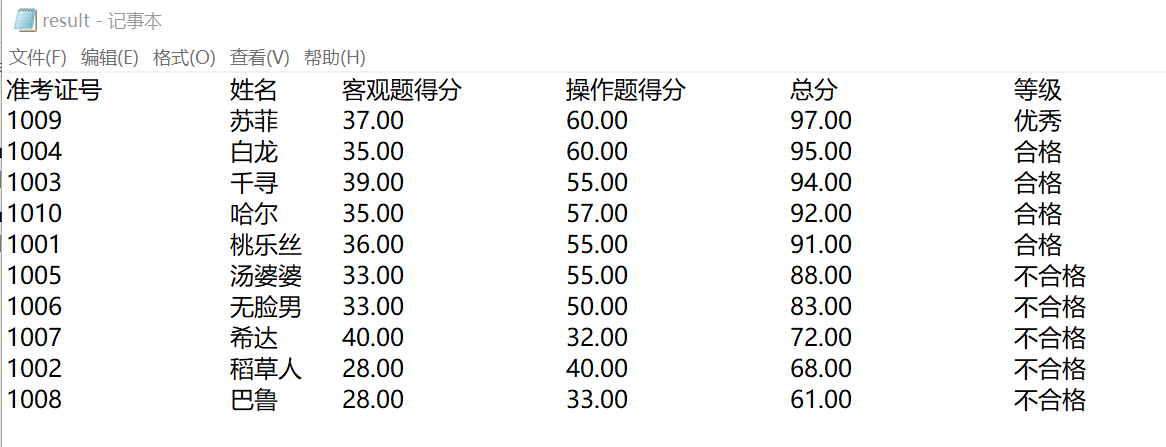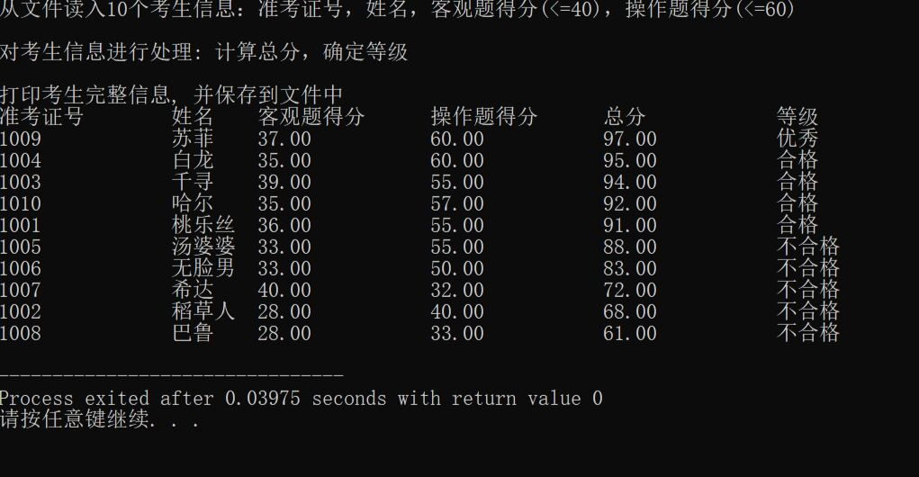 #include<stdio.h> #include<string.h> #include<stdlib.h> #define N 10 typedef struct { long int id; char name[20]; float objective; float subjective; float sum; char level[10]; }STU; void input(STU s[], int n); void output(STU s[], int n); void process(STU s[], int n); int main() { STU stu[N]; printf("从文件读入%d个考生信息:准考证号,姓名,客观题得分(<=40),操作题得分(<=60)\n", N); input(stu, N); printf("\n对考生信息进行处理: 计算总分,确定等级\n"); process(stu, N); printf("\n打印考生完整信息, 并保存到文件中"); output(stu, N); return 0; } void input(STU s[], int n) { int i; FILE *fin; fin=fopen("examinee.txt","r"); if(fin==NULL) { printf("fail to open file\n"); exit(0); } while(!feof(fin)) { for(i=0;i<n;i++) fscanf(fin, "%ld %s %f %f", &s[i].id, s[i].name, &s[i].objective, &s[i].subjective); } fclose(fin); } void output(STU s[],int n) { FILE *fout; int i; printf("\n"); printf("准考证号\t姓名\t客观题得分\t操作题得分\t总分\t\t等级\n"); for(i=0;i<n;i++) printf("%ld\t\t%s\t%.2f\t\t%.2f\t\t%.2f\t\t%s\n", s[i].id, s[i].name, s[i].objective, s[i].subjective, s[i].sum, s[i].level); fout=fopen("result.txt","w"); if(!fout) { printf("fail to open or create result.txt\n"); exit(0); } fprintf(fout, "准考证号\t\t姓名\t客观题得分\t操作题得分\t总分\t\t等级\n"); for(i=0;i<n;i++) fprintf(fout, "%ld\t\t%s\t%.2f\t\t%.2f\t\t%.2f\t\t%s\n", s[i].id, s[i].name, s[i].objective, s[i].subjective, s[i].sum, s[i].level); fclose(fout); } void process(STU s[], int n) { int i,j,k; float Y,L; STU temp; for(i=0;i<n;i++) s[i].sum=s[i].objective+s[i].subjective; for(i=1;i<n;i++) for(j=0;j<i;j++) { if(s[i].sum>s[j].sum) { k=j; temp=s[i]; for(j=i-1;j>=k;j--) s[j+1]=s[j]; s[k]=temp; } } Y=s[(int)(n*0.1-1)].sum; L=s[(int)(n*0.5-1)].sum; for(i=0;i<n;i++) if(s[i].sum>=Y) strcpy(s[i].level,"优秀"); else if(s[i].sum>=L) strcpy(s[i].level,"合格"); else strcpy(s[i].level,"不合格"); }