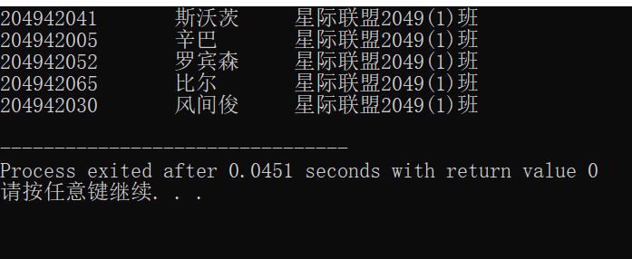 #include <stdio.h> #include <stdlib.h> #include <time.h> #define M 80 #define N 5 typedef struct { long int id; char name[20]; char classes[80]; int target; } STU; void input(STU s[], int n); void random(STU s[],STU lucky[],int m,int n); void output(STU lucky[], int n); int main() { STU stu[M]; STU lucky[N]; input(stu, M); random(stu,lucky,M,N); output(lucky,N); return 0; } void input(STU s[], int n) { int i; FILE *fin; fin = fopen("list.txt", "r"); if (fin == NULL) { printf("fail to open file\n"); exit(0); } while (!feof(fin)) { for (i = 0; i < n; i++) fscanf(fin, "%ld %s %s", &s[i].id, s[i].name, s[i].classes); } fclose(fin); } void random(STU s[],STU lucky[],int m,int n) { int k = 0; srand(time(NULL)); while (k < n) { int i = rand()%m + 1; lucky[k] = s[i]; k++; } } void output(STU lucky[], int n) { for (int i = 0; i < 5; i++) printf("%ld\t%-10s %-10s\n", lucky[i].id, lucky[i].name, lucky[i].classes); FILE *fout; fout = fopen("lucky.txt", "w"); for (int i = 0; i < n; i++) fprintf(fout, "%ld\t%-10s %-10s\n", lucky[i].id, lucky[i].name, lucky[i].classes); fclose(fout); }