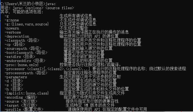 测试配置成功,cmd中输入javac,显示如下界面: