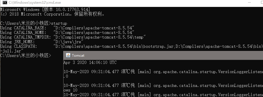 保存系统变量的配置之后,按win+R键打开运行,输入cmd,点击确定,在命令行中输入“startup”,启动tomcat服务,启动成功代表环境变量配置成功,