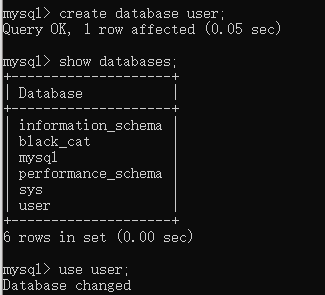 (2).创建用户数据库(create database 数据库名;),然后用命令(show databases;)查看是否创建成功并且打开数据库(use 数据库名;)