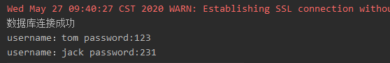 Connection con; String driver="com.mysql.jdbc.Driver"; //这里我的数据库是user String url="jdbc:mysql://localhost:3306/user"; String user="root"; String password="123456"; try { Class.forName(driver); con = DriverManager.getConnection(url, user, password); if (!con.isClosed()) { System.out.println("数据库连接成功"); } Statement statement = con.createStatement(); String sql = "select * from user_table;";//我的表格叫user_table ResultSet resultSet = statement.executeQuery(sql); String name; while (resultSet.next()) { name = resultSet.getString("username"); pwd = resultSet.getString("password"); System.out.println("username:" + name + " password:" + pwd); } resultSet.close(); con.close(); } catch (ClassNotFoundException e) { System.out.println("数据库驱动没有安装"); } catch (SQLException e) { System.out.println("数据库连接失败"); }
