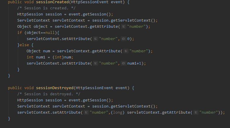 import javax.servlet.ServletContext; import javax.servlet.ServletContextEvent; import javax.servlet.ServletContextListener; import javax.servlet.annotation.WebListener; import javax.servlet.http.*; @WebListener() public class SessionListener implements ServletContextListener, HttpSessionListener, HttpSessionAttributeListener { // Public constructor is required by servlet spec public SessionListener() { } // ------------------------------------------------------- // ServletContextListener implementation // ------------------------------------------------------- public void contextInitialized(ServletContextEvent sce) { /* This method is called when the servlet context is initialized(when the Web application is deployed). You can initialize servlet context related data here. */ } public void contextDestroyed(ServletContextEvent sce) { /* This method is invoked when the Servlet Context (the Web application) is undeployed or Application Server shuts down. */ } // ------------------------------------------------------- // HttpSessionListener implementation // ------------------------------------------------------- public void sessionCreated(HttpSessionEvent event) { /* Session is created. */ HttpSession session = event.getSession(); ServletContext servletContext = session.getServletContext(); Object object = servletContext.getAttribute("number"); if (object==null){ servletContext.setAttribute("number",0); }else { Object num = servletContext.getAttribute("number"); int num1 = (int)num; servletContext.setAttribute("number",num1+1); } } public void sessionDestroyed(HttpSessionEvent event) { /* Session is destroyed. */ HttpSession session = event.getSession(); ServletContext servletContext = session.getServletContext(); servletContext.setAttribute("number",(long) servletContext.getAttribute("number")); } // ------------------------------------------------------- // HttpSessionAttributeListener implementation // ------------------------------------------------------- public void attributeAdded(HttpSessionBindingEvent sbe) { /* This method is called when an attribute is added to a session. */ } public void attributeRemoved(HttpSessionBindingEvent sbe) { /* This method is called when an attribute is removed from a session. */ } public void attributeReplaced(HttpSessionBindingEvent sbe) { /* This method is invoked when an attibute is replaced in a session. */ } }
