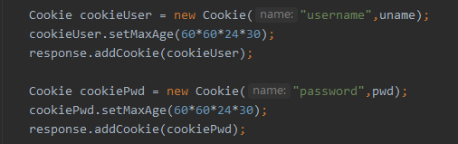 import javax.servlet.ServletException; import javax.servlet.annotation.WebServlet; import javax.servlet.http.Cookie; import javax.servlet.http.HttpServlet; import javax.servlet.http.HttpServletRequest; import javax.servlet.http.HttpServletResponse; import java.io.IOException; @WebServlet(name = "SetCookie") public class SetCookie extends HttpServlet { protected void doPost(HttpServletRequest request, HttpServletResponse response) throws ServletException, IOException { } protected void doGet(HttpServletRequest request, HttpServletResponse response) throws ServletException, IOException { Cookie coo = new Cookie("username", "tom");//创建一个键值对的cookie对象 coo.setMaxAge(60*60*24*7);//设置cookie的生命周期 response.addCookie(coo);//添加到response中 } }