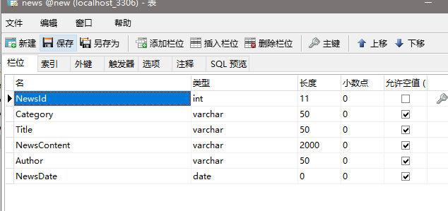 (1)打开mysql可视化工具找到新闻数据库创建新闻表以及用户表