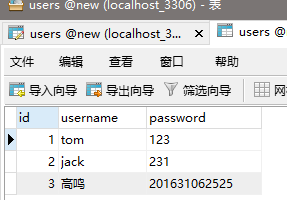输入用户表中数据用户名:高鸣,密码:201631062525