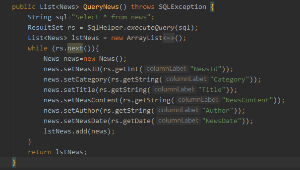 再新建个Service包并在包里新建个NewsService用来连接新闻数据库并读取新闻表中的数据并转换成列表形式