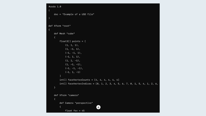 USD(通用场景描述)由皮克斯动画工作室开发,是一种开源格式,用于表示和交换3D场景和资产。它提供了一种强大高效的复杂场景处理方式,包括支持几何体、材质、着色、动画等。
