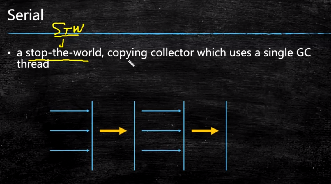 它的 “单线程” 的意义不仅仅意味着它只会使用一条垃圾收集线程去完成垃圾收集工作,更重要的是它在进行垃圾收集工作的时候必须暂停其他所有的工作线程( "Stop The World" ),直到它收集结束。