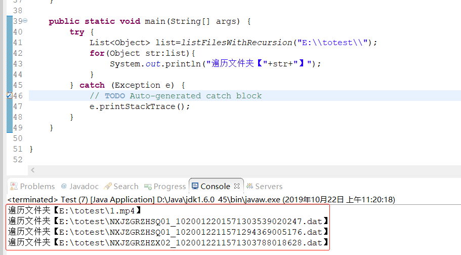 package com.yinxin.control; import java.io.File; import java.util.ArrayList; import java.util.List; /** * @version 1.0 递归扫描文件夹 * @author syp * @time 2019年10月22日11:16:00 */ public class Test { private static ArrayList<Object> listFiles = new ArrayList<Object>(); public static ArrayList<Object> listFilesWithRecursion(String folderPath) throws Exception{ ArrayList<String> dirctorys = new ArrayList<String>(); File directory = new File(folderPath); if(!directory.isDirectory()){ throw new Exception('"' + folderPath + '"' + " input path is not a Directory , please input the right path of the Directory"); } if(directory.isDirectory()){ File [] filelist = directory.listFiles(); //路径名的目录中的文件和目录的数组 for(int i = 0; i < filelist.length; i ++){ /**如果当前是文件夹,进入递归扫描文件夹**/ if(filelist[i].isDirectory()){ dirctorys.add(filelist[i].getAbsolutePath()); /**递归扫描下面的文件夹**/ listFilesWithRecursion(filelist[i].getAbsolutePath()); } /**非文件夹**/ else{ listFiles.add(filelist[i].getAbsolutePath()); } } } return listFiles; } public static void main(String[] args) { try { List<Object> list=listFilesWithRecursion("E:\\totest\\"); for(Object str:list){ System.out.println("遍历文件夹【"+str+"】"); } } catch (Exception e) { // TODO Auto-generated catch block e.printStackTrace(); } } }