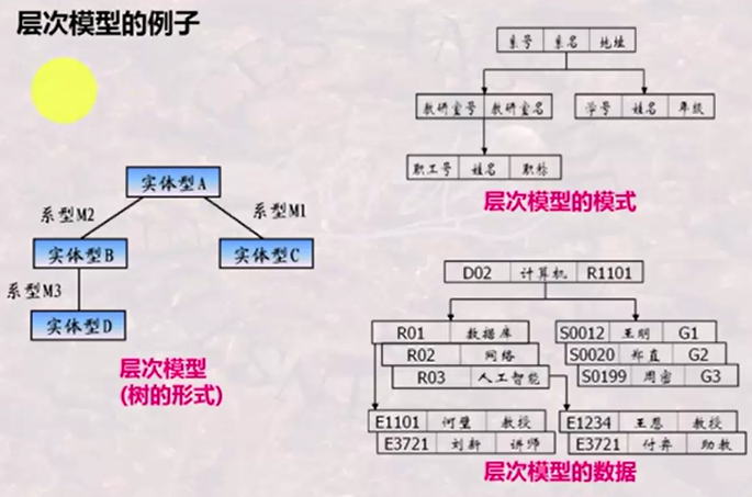 层次模型:基于树形结构的模型,每个节点都只有一个父节点,由实体性(一条记录)和系型(连接两条记录的联系,类似于链表的指针)组成
