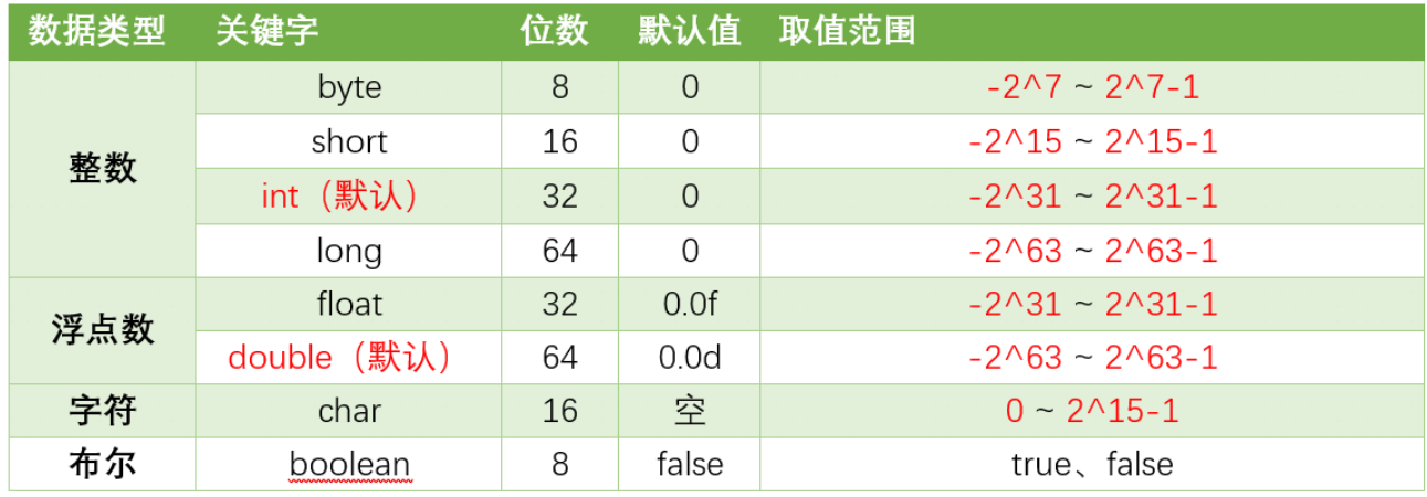 1.1 8种基本的数据类型: boolean、byte、short、int、long、float、double、char、