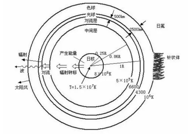 辐射区:范围从1/4到4/5太阳半径。辐射区的物质吸收辐射再发出辐射,将热核反应区产生的能量向外传送。
