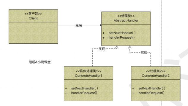 - ConcreteHandler具体处理者:处理所负责的请求,可访问它的后续节点,如果可处理该请求就处理,否则就将该请求转发给它的后续节点。