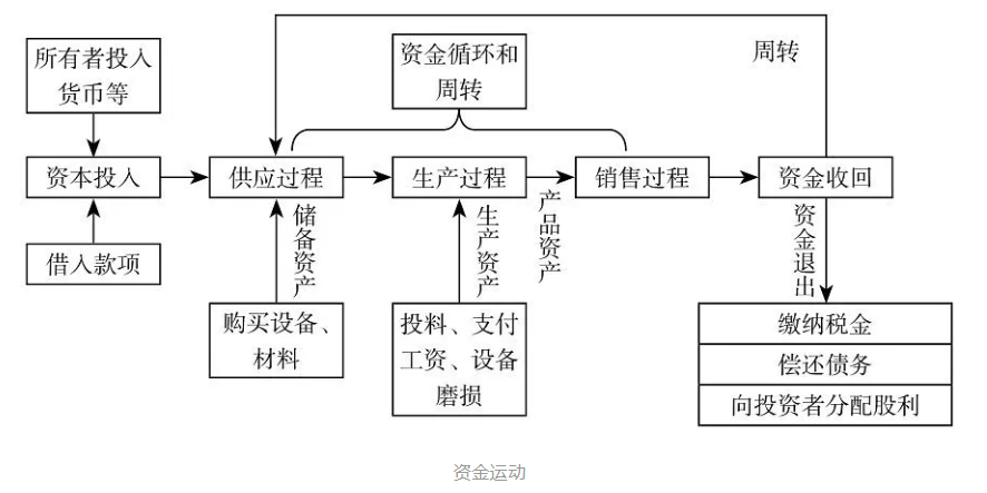资金运动包括资产的投入(股东投入、债权人投入)、资金的循环(供应——货币流出、生产——价值形态转化、销售——货币流入)和资金退出(分红——股东、还债——债权人、缴税——国家,最彻底的是清算,企业就没了)