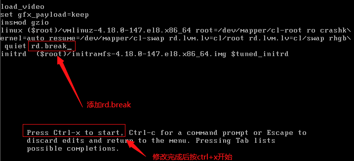2、进入编辑模式,在如下位置添加rd.break,修改完成后按ctrl-x