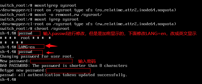 6、输入passwd进行密码修改,如果加密显示,就改一下英文显示LANG=en