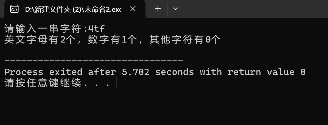 printf("英文字母有%d个,数字有%d个,其他字符有%d个\n",y,s,k);