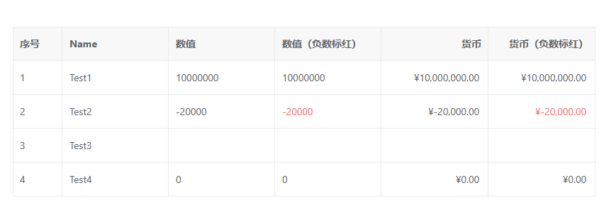 { field: 'num4', title: '货币(负数标红)', align: 'right', cellRender: { name: 'FormatNumberInput', showNegativeStatus: true, props: { type: 'amount', align: 'right', showCurrency: true } } }