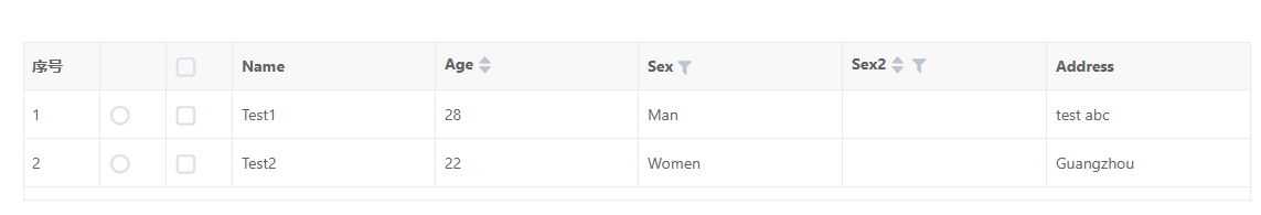 { id: 10001, name: 'Test1', role: 'Develop', sex: 'Man', age: 28, address: 'test abc' },