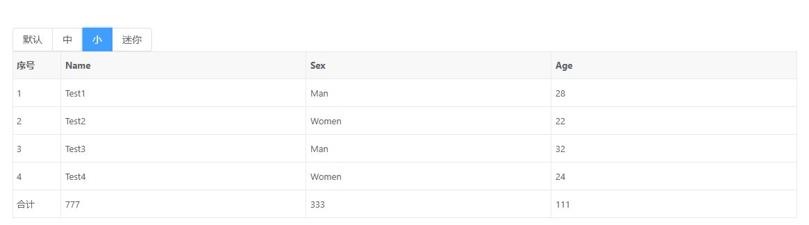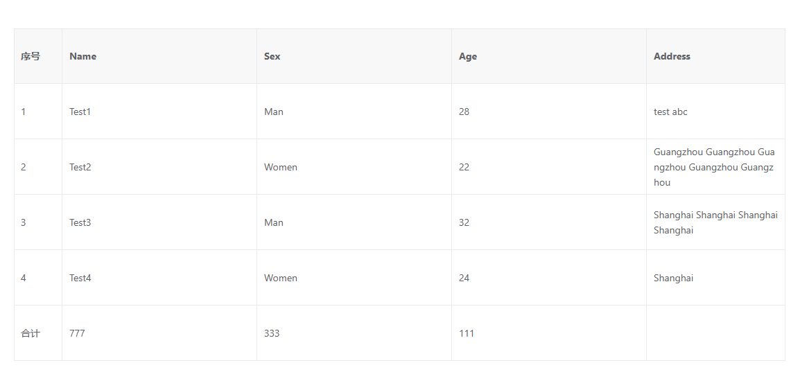 { seq: '合计', name: '777', sex: '333', age: '111' }