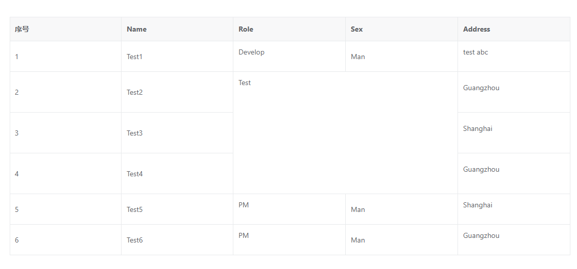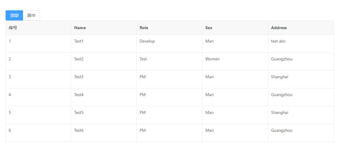 { id: 10005, name: 'Test5', role: 'PM', sex: 'Man', age: 56, address: 'Shanghai' },