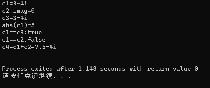 #include"complex.hpp" void test(){ using namespace std; Complex c1(3,-4); const Complex c2(4.5); Complex c3(c1); cout<<"c1="; c1.show(); cout<<endl; cout<<"c2.imag="<<c2.get_imag()<<endl; cout<<"c3="; c3.show(); cout<<endl; cout<<"abs(c1)="; cout<<abs(c1)<<endl; cout<<boolalpha; cout<<"c1==c3:"<<is_equal(c1,c3)<<endl; cout<<"c1==c2:"<<is_equal(c1,c2)<<endl; Complex c4; c4=add(c1,c2); cout<<"c4=c1+c2="; c4.show(); cout<<endl; } int main(){ test(); }