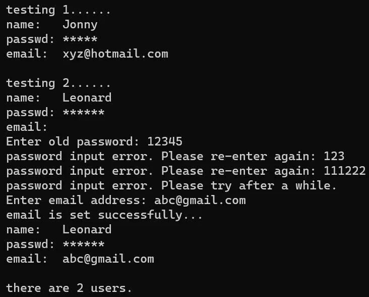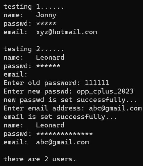 #pragma once #include <iostream> #include <string> using namespace std; class User{ public: User(std::string name, std::string passwd = "111111", std::string email = " "):name{name}, passwd{passwd}, email{email} {n++;} void set_email(); void change_passwd(); void print_info(); static void print_n(); private: string name; string passwd; string email; static int n; }; int User::n = 0; void User::set_email(){ cout << "Enter email address: " ; cin >> email; cout << "email is set successfully..." << endl; } void User::change_passwd() { string p,a; cout << "Enter old password: " ; cin >> p; int i = 0; while (p != passwd){ i ++; cout << "password input error. Please re-enter again: "; cin >> p; if (i>=2){ cout << "passwword input error. Please try after a while" << endl; break; } } if (p == passwd){ cout << " Enter new passwd: "; cin >> a; cout << "new passwd is set successfully..."; } } void User::print_info(){ string s(passwd.size(), '*'); cout << "name: " << name << endl; cout << "passwd: " << s << endl; cout << "email: " << email << endl; } void User::print_n(){ cout << "there are " << n << "users" << endl; }