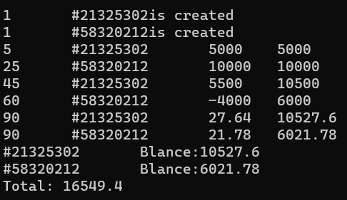 #include "account.h" #include <cmath> #include <iostream> using namespace std; double SavingsAccount::total = 0; //SavingsAccount类相关成员函数的实现 SavingsAccount::SavingsAccount(int date, int id, double rate):id(id), balance(0), rate(rate), lastDate(date), accumulation(0){ cout << date << "\t#" << id << "is created" << endl; } void SavingsAccount::record(int date, double amount){ accumulation = accumulate(date); lastDate = date; amount = floor(amount * 100 + 0.5) / 100; //保留小数点后两位 balance += amount; total += amount; cout << date << "\t#" << id << "\t" << amount << "\t" << balance <<endl; } void SavingsAccount::deposit(int date, double amount) { record(date, amount); } void SavingsAccount::withdraw(int date, double amount){ if (amount > getBlance()) cout << "Error: not enough money" << endl; else record(date, -amount); } void SavingsAccount::settle(int date){ double interest = accumulate(date) * rate/365; //计算年息 if (interest != 0) record(date, interest); accumulation = 0; } void SavingsAccount::show() const { cout << "#" << id << "\tBlance:" << balance; }