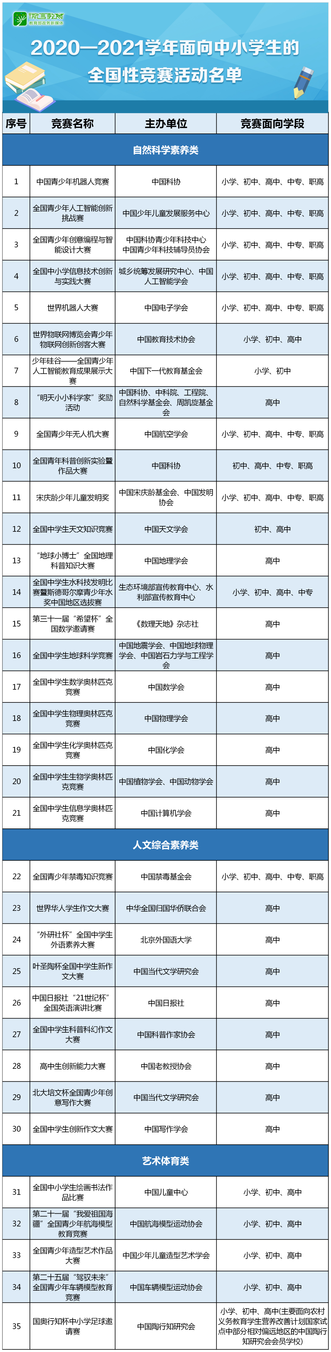 2020-2021学年面向中小学生的全国性竞赛活动名单公布