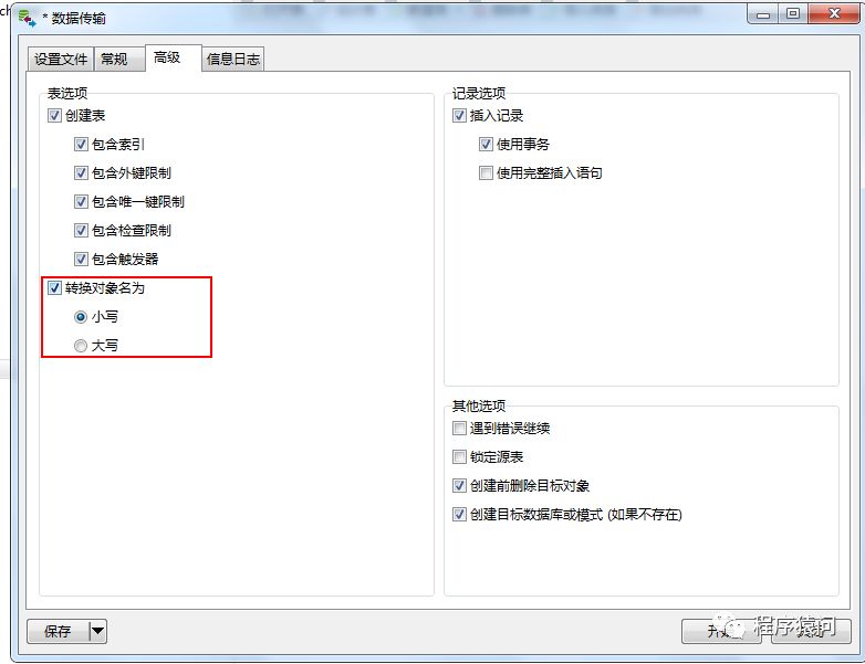2、右击oracle数据库,选择“数据传输”,模式选择当前数据库,目标选择要转换的数据库,由于oracle表的名字都是大写,如果需要转成小写的朋友,在高级里面设置,选择小写即可