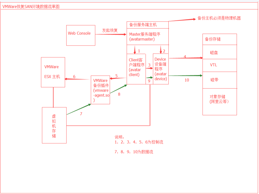 VMWare备份Lan环境与San环境备份的区别在于要备份的虚拟机所在的存储是否挂载到备份服务端主机。备份的数据流是通过ESX主机走网络传送还是直接通过挂载目录传送。
