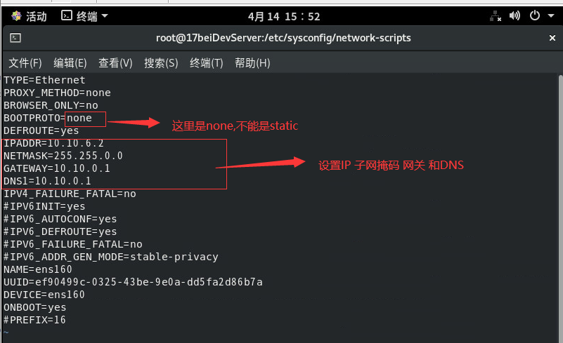vi ifcfg-ens160后修改如下图: