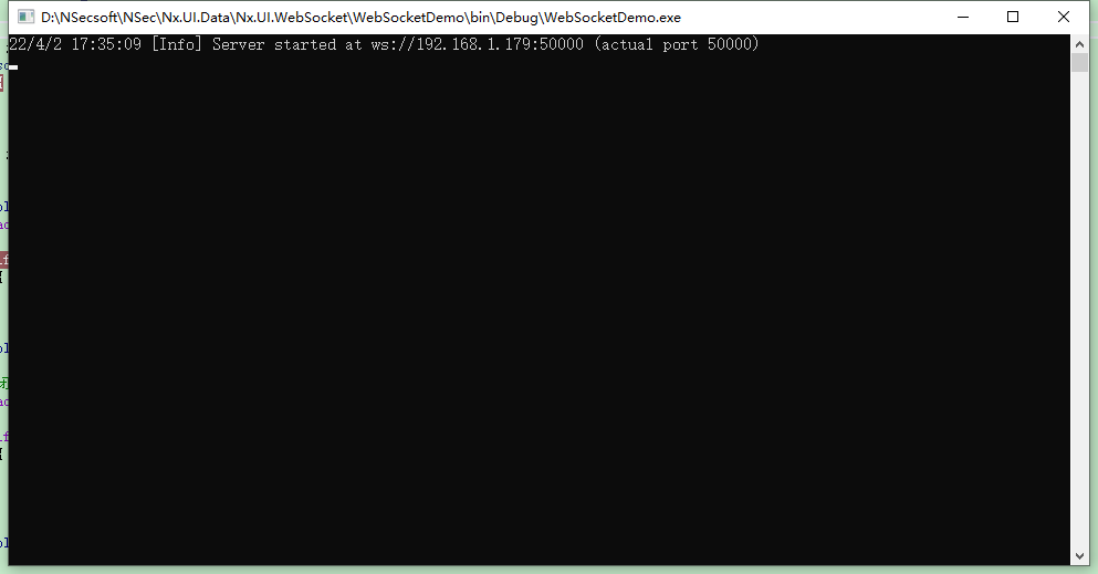 4、运行启动,查看效果,可以看到websocket服务端已经启动,接下来是客户端