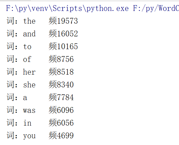 if __name__ == "__main__": dst = 'src/Gone_with_the_wind.txt' # 《飘》文件的路径 bvffer = process_file(dst) word_freq = process_buffer(bvffer) output_result(word_freq)