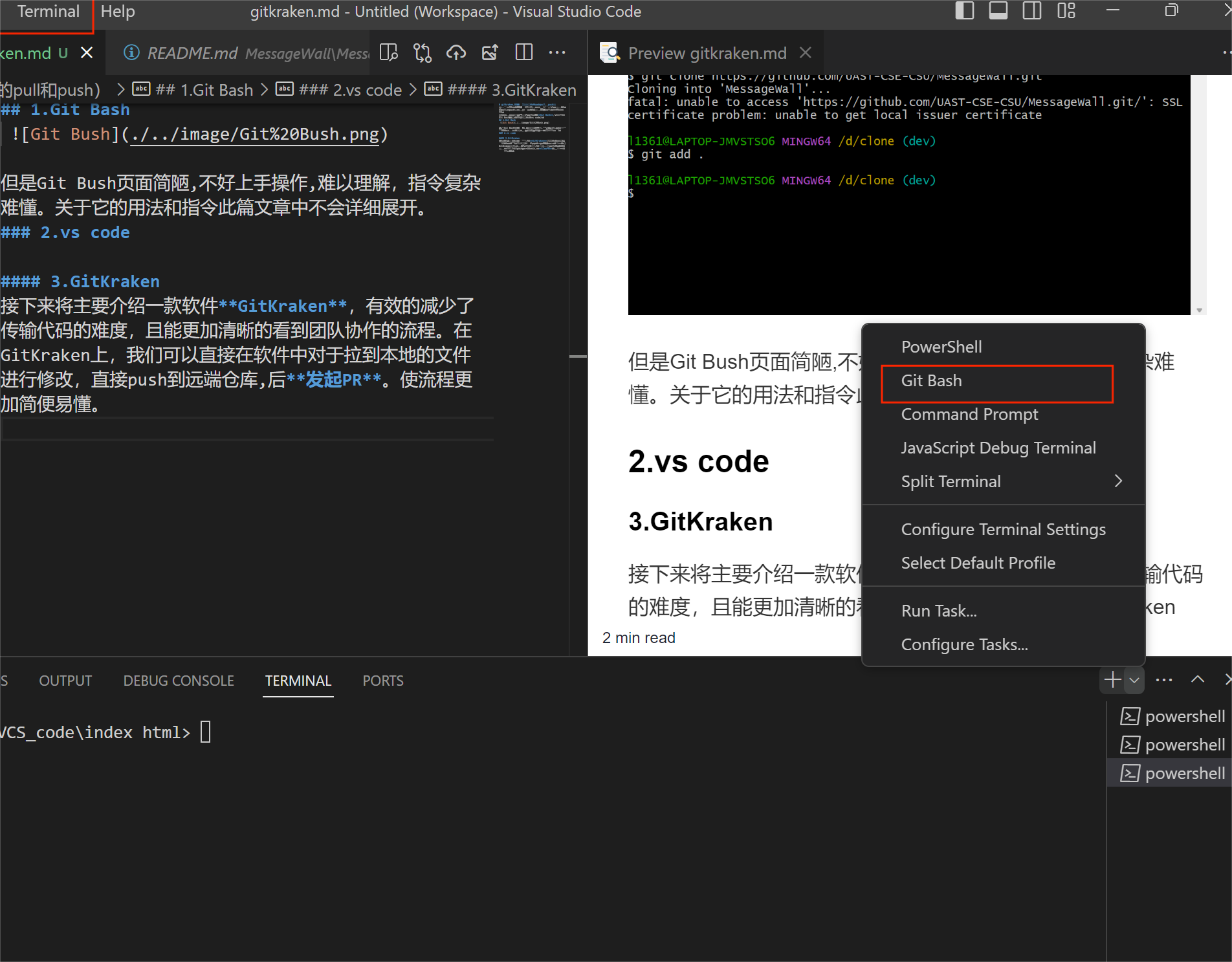 此处Git Bush成为vs code的一个功能,但具体操作方法与Git相同,此处不重点介绍。