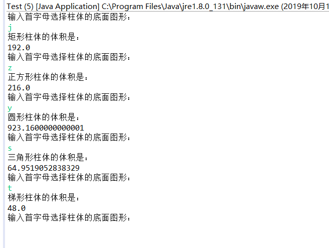 case's':System.out.println("三角形柱体的体积是:");tuxing=new ShanJiaoXing(5,5,5);break;