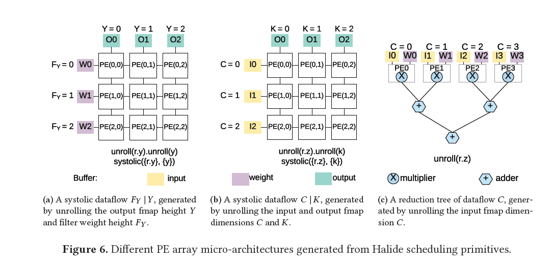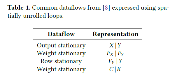 - 意思就是卷积的7层循环,任意两层被spatially unrolled in hardware,形成不同的dataflow。For example, if the X and Y loops are unrolled onto the 2D array, then each PE produces a single output pixel