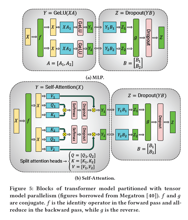 - Y = gelu(XA) Z = dropout(YB) -> [Y1,Y2] = [gelu(XA1, XA2)] -> B = [B1, B2]T -> Z = dropout(Y1B1+Y2B2) 注意:加号这里是all-reduce
