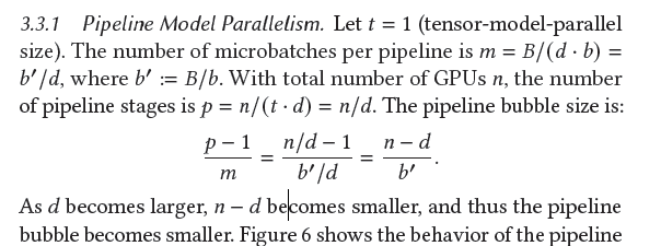 - bubble size = p-1/m = (n/t - 1) / m,As 𝑡 increases, the pipeline bubble thus decreases for fixed 𝐵, 𝑏,n(实际上,减少深度p就能减少bubble size,t只是提供了一种减少p的方式(有了t,pipeline每个阶段可以处理更多层,可以有更少阶段p))