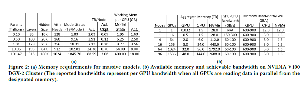 For example, on 64 DGX-2 nodes, ZeRO-Infinity has access to over 3TB/s of CPU memory bandwidth and over 1.5TB/s of NVMe bandwidth